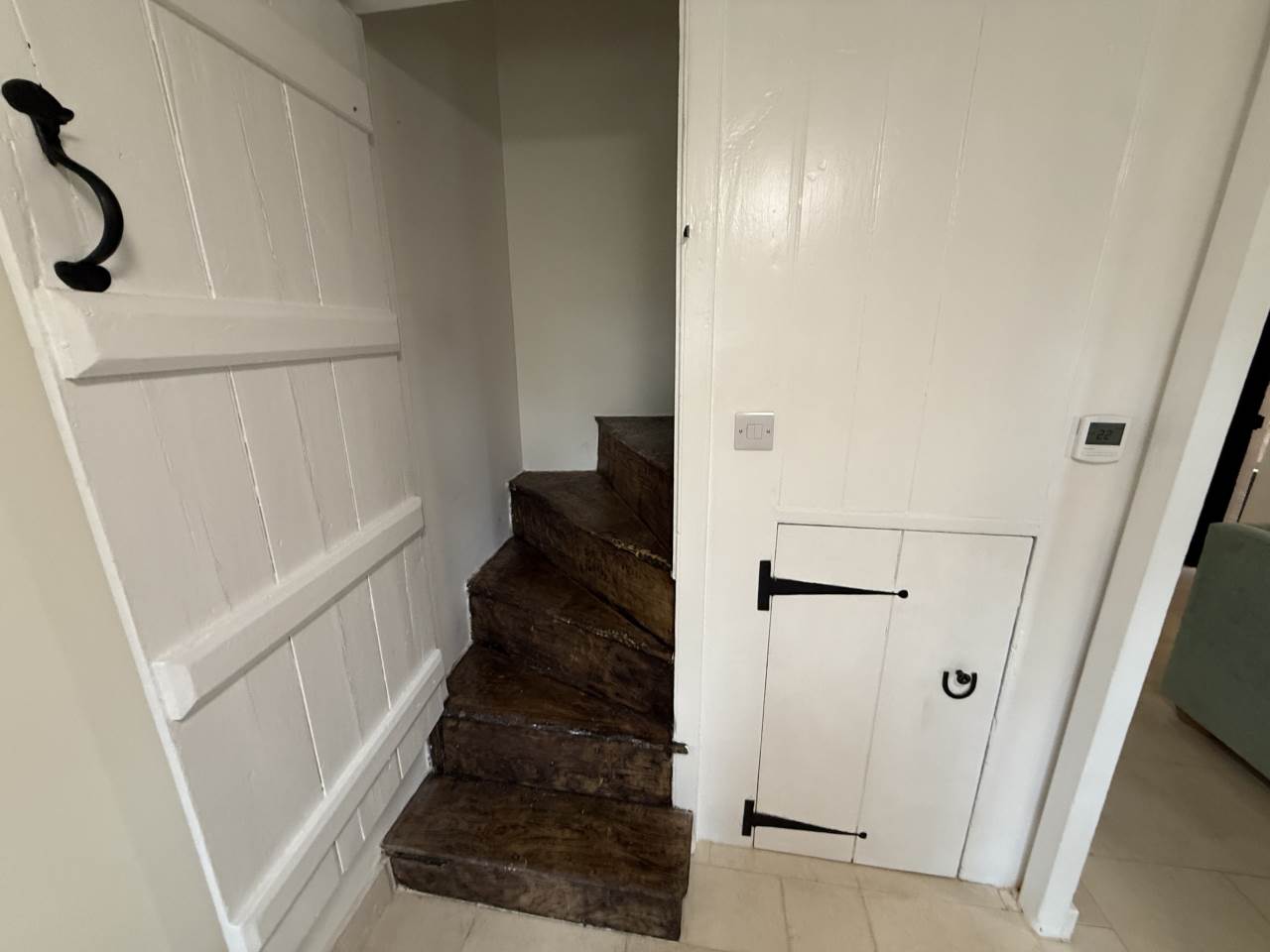 Upstairs, the property offers two generously sized double bedrooms, both showcasing attractive wooden floorboards that complement the cottage’s character.