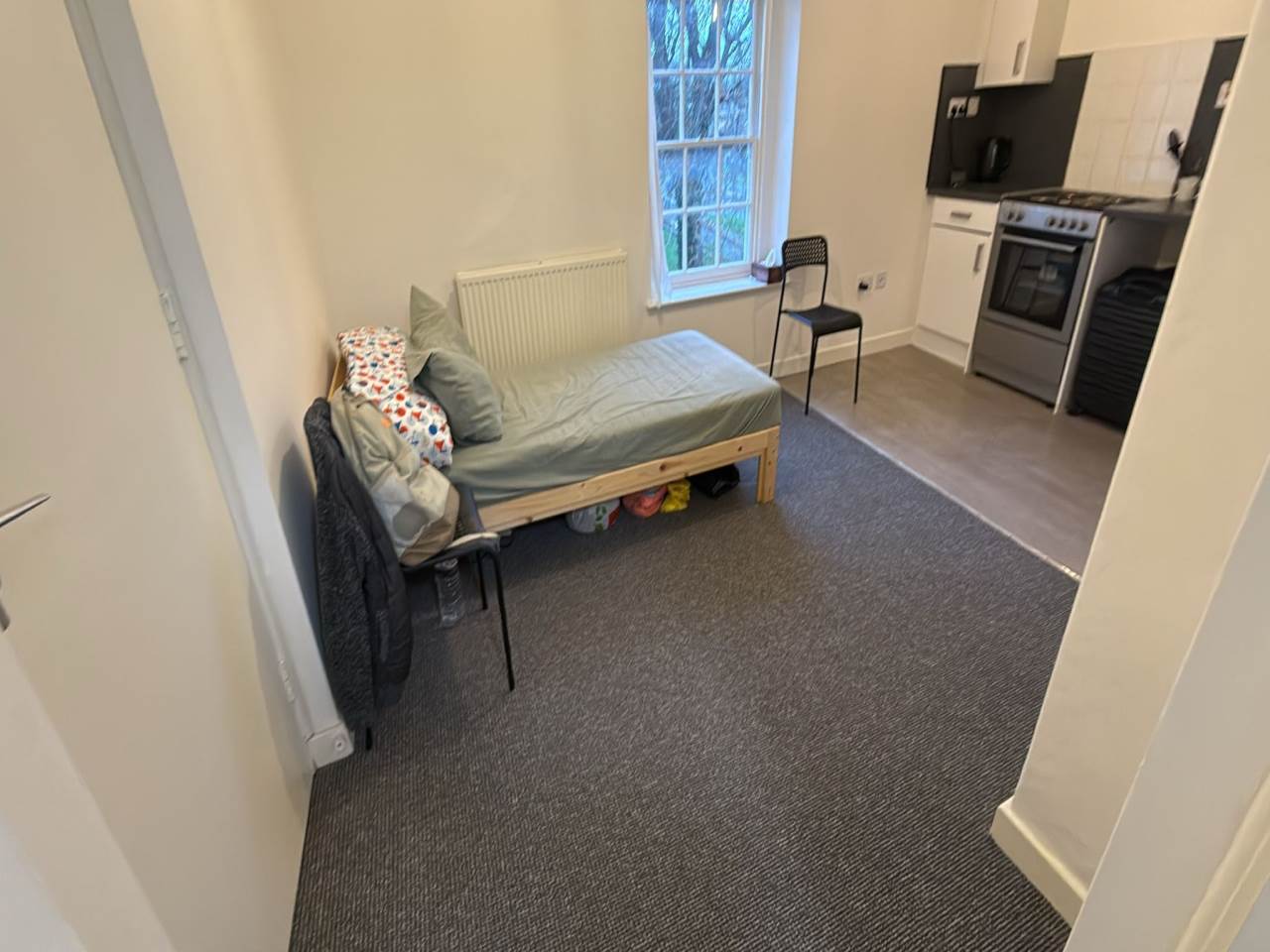 Top-floor studio flat, featuring an open-plan kitchen/lounge/bedroom area with a shower room. Additionally, there is access to a communal utility room, communal garden and parking area for added convenience.